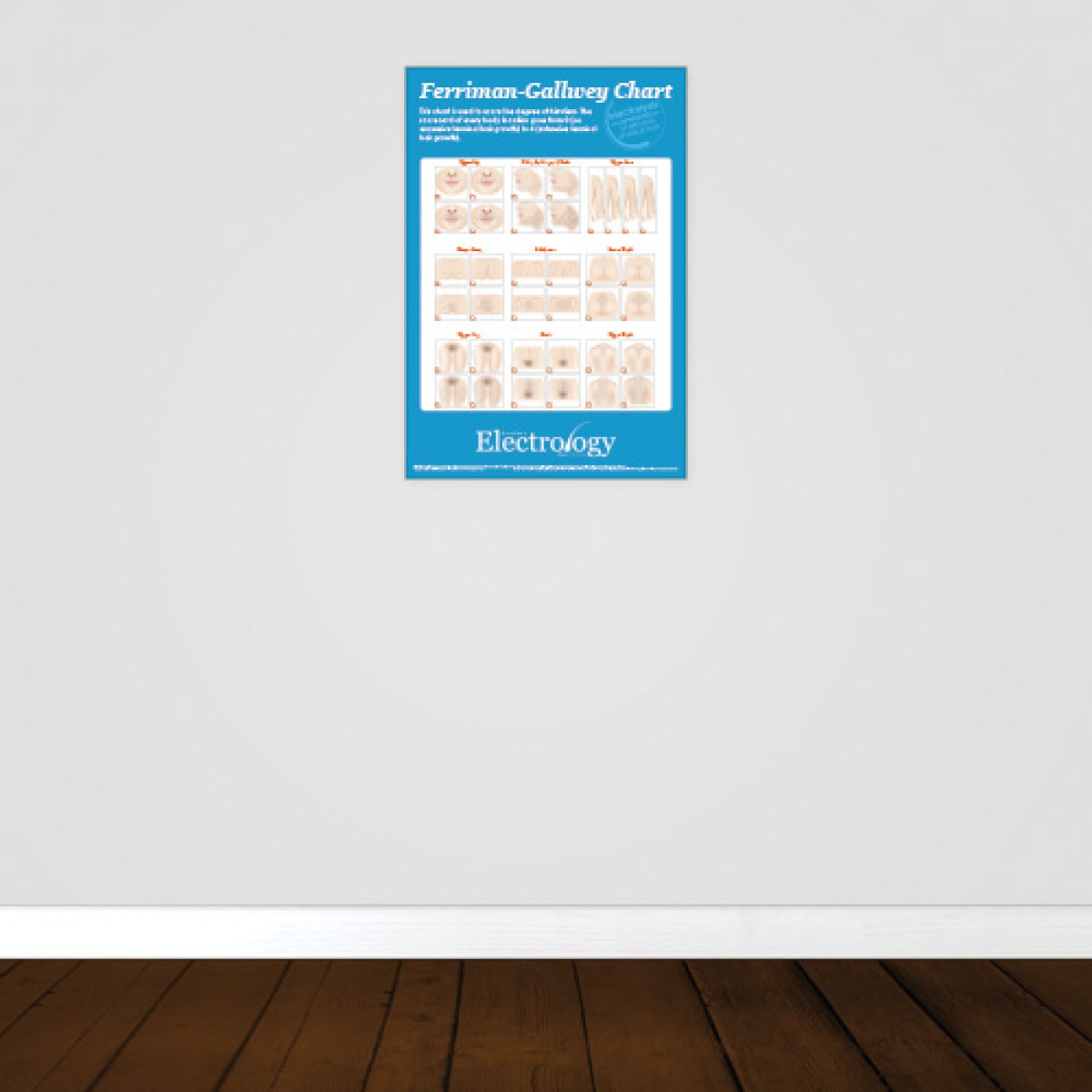 This informational poster features illustrations custom-designed for electrologists showing hair growth volume and patterns for a range of areas.