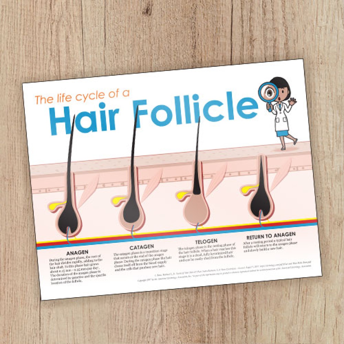 This friendly, professionally-designed 2-sided consultation card provides useful illustrations of the hair growth cycle on the front and the effects of different types of hair removal on the back. Laminated card stock.