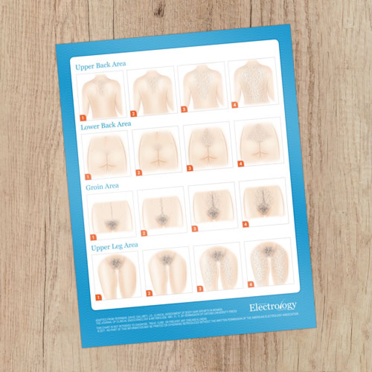 This modest informational 2-sided consultation card features illustrations custom-designed for electrologists showing hair growth volume and patterns for a range of areas. Laminated card stock.Size: 8.5 x 11"..