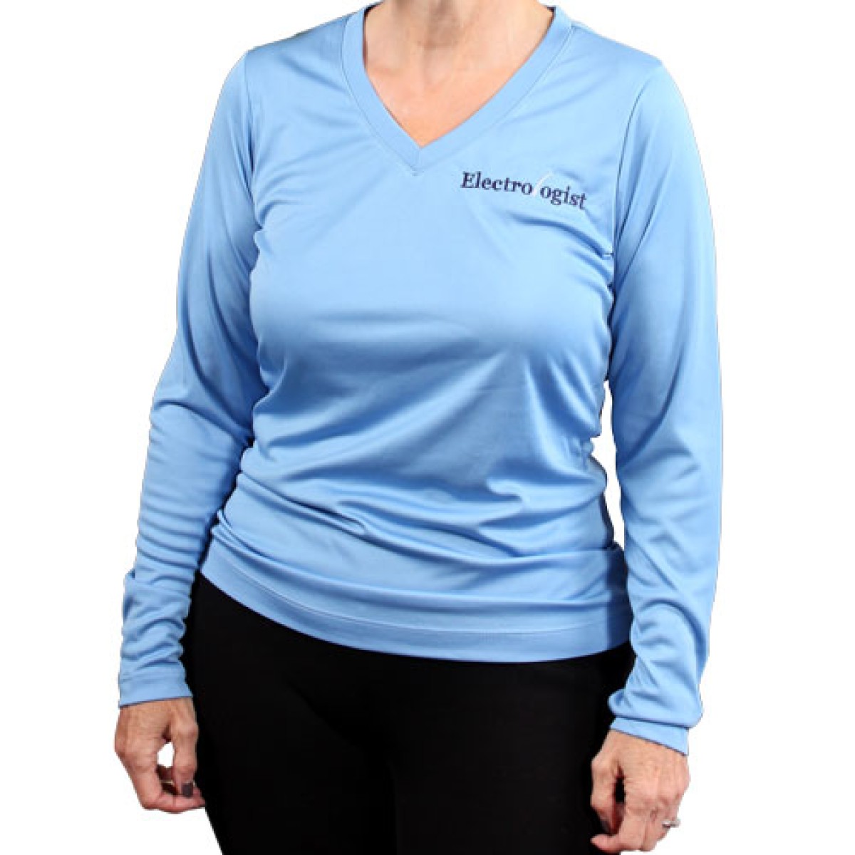 This long sleeve v-neck tee in comfortable Carolina Blue stretch polyester is a great everyday choice. The stylized "Electrologist" logo is printed in elegant black-and-white.